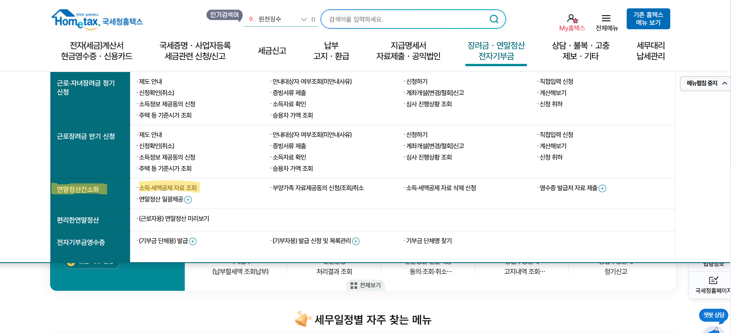 상단 메뉴에서 ‘장려금.연말정산 전자기부금’ → ‘연말정산 간소화’→'소득.세액공제 자료 조회' 선택.