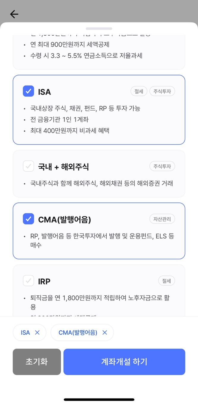 3) 원하는 개설 항목을 선택하시면 되는데 여기서 ISA를 필수로 선택합니다.