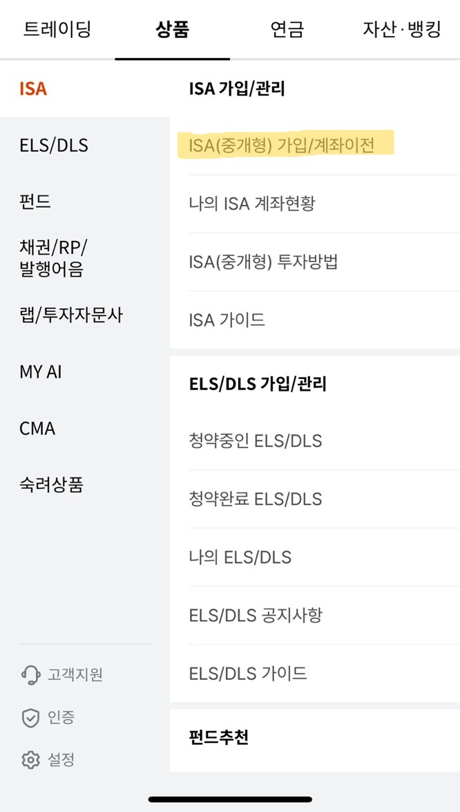 1) 한국투자증권 앱의 홈 화면 왼쪽 하단의 "메뉴"를 누른 뒤 "상품"을 클릭합니다. 그리고 "ISA(중개형) 가입/계좌이전"을 클릭합니다.