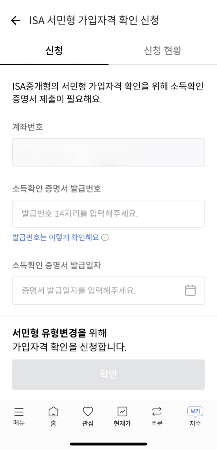나의 ISA 계좌현황을 클릭한 뒤 신청을 하실 수 있는데요. 계좌번호와 소득확인 증명서 발급번호를 입력하면 신청이 완료됩니다. 주의할 점은 온라인 신청도 영업시간인 오전 9시부터 16시 내에만 신청이 가능합니다.